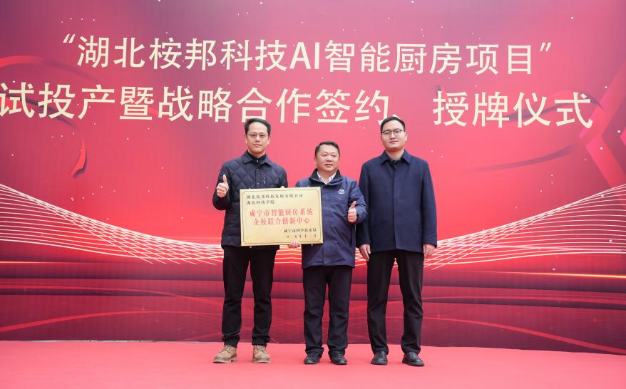 仪式上,在通城县副县长韩旭辉同志的见证下,365上市公司与桉邦科技共同揭牌成立“咸宁市智能厨房系统企校联合创新中心”。该中心旨在以AI智能厨房系统为主攻方向,整合学院在自动化、机械工程、智能控制、材料科学等领域的学科优势与企业实战经验,共同开展智能烹饪设备研发、物联网控制系统优化、自动化流程创新等关键技术的协同攻关。
