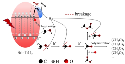 通过系统调控光强、波长和温度,研究显示提升光强可使τSC降低1.33倍,短波长光照虽穿透性差但τSC缩短2.41倍,温度升至50°C时τSC下降3.51倍(图2)。同时,Sn掺杂能有效抑制升温带来的电荷泄漏加剧问题,优化后的Pt/3% Sn-TiO2在30 W紫外光(254 nm)、80°C条件下,氢气产率达82.86 mmol⋅g−1⋅h−1,甲醛产率84.13 mmol⋅g−1⋅h−1,表观量子效率(AQY)达40.02%,各项性能在现有文献报道中处于领先地位。